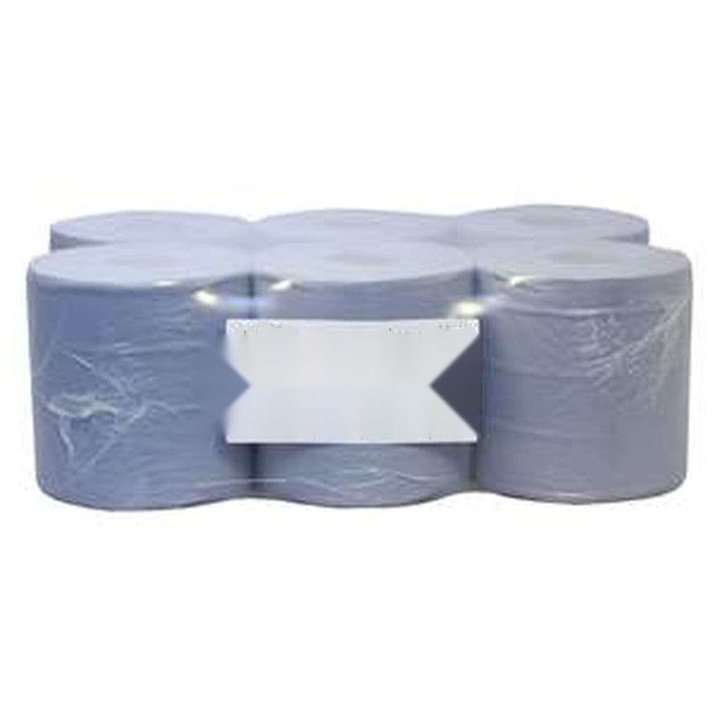 Essential workshop cleaning supplies. Pack of 6 blue centre feed paper rolls, each 114 metres long, for efficient spill management and general workshop upkeep.