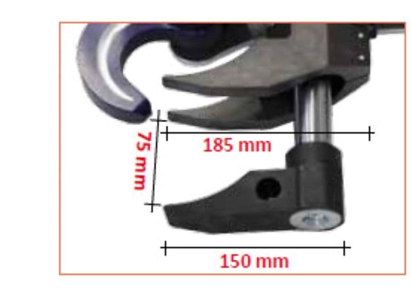 - Dimensions indicated: Jaw opening 75 mm, reach 185 mm, base width 150 mm.